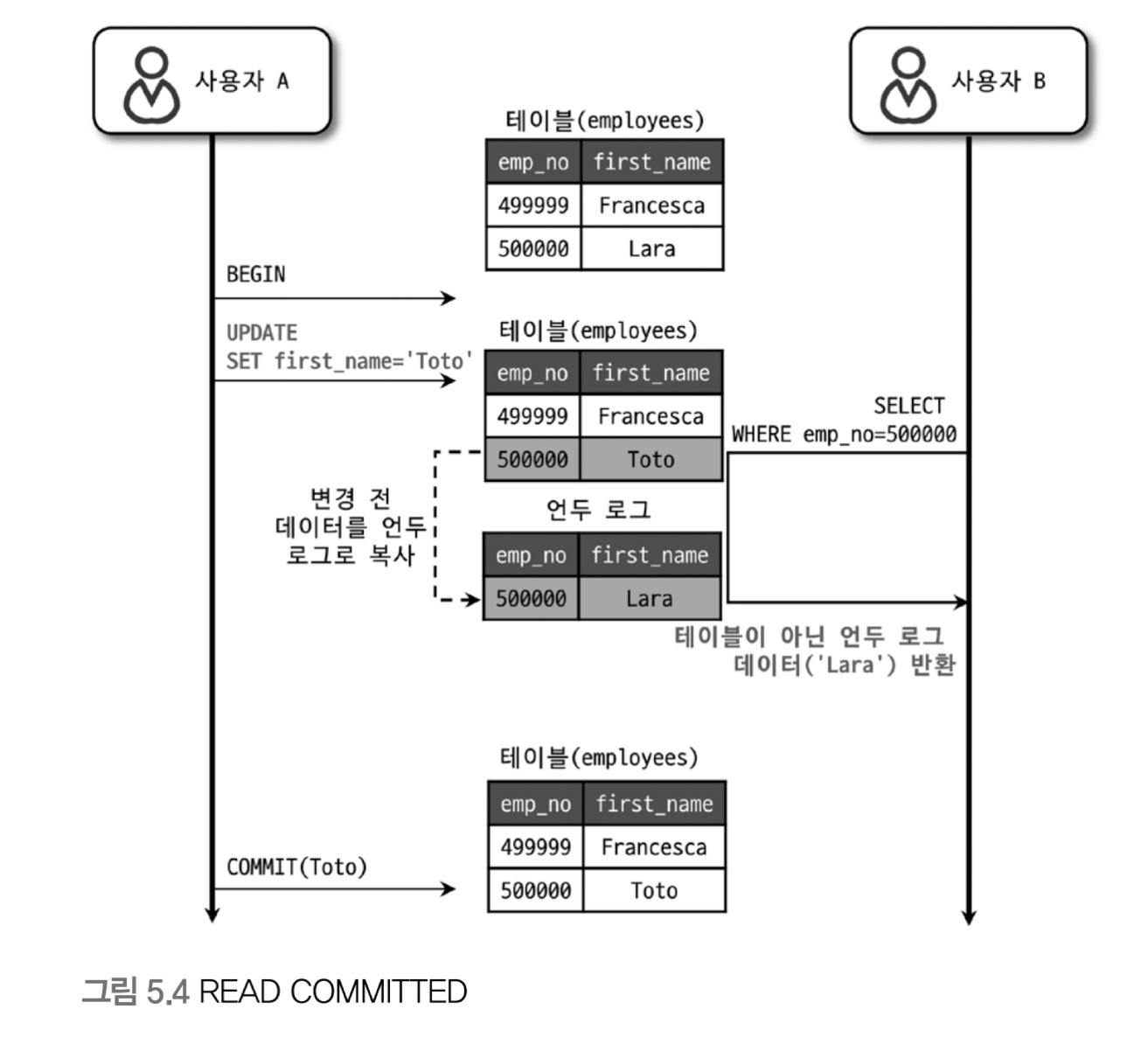 - 사용자 A가 커밋을 수행하기 전에 사용자 B가 emp_no = 500000인 사원을 SELECT하면 테이블이 아니라 언두 영역에 백업된 레코드에서 값을 가져오기 때문에 "Toto"가 아니라 "Lara"가 조회된다.