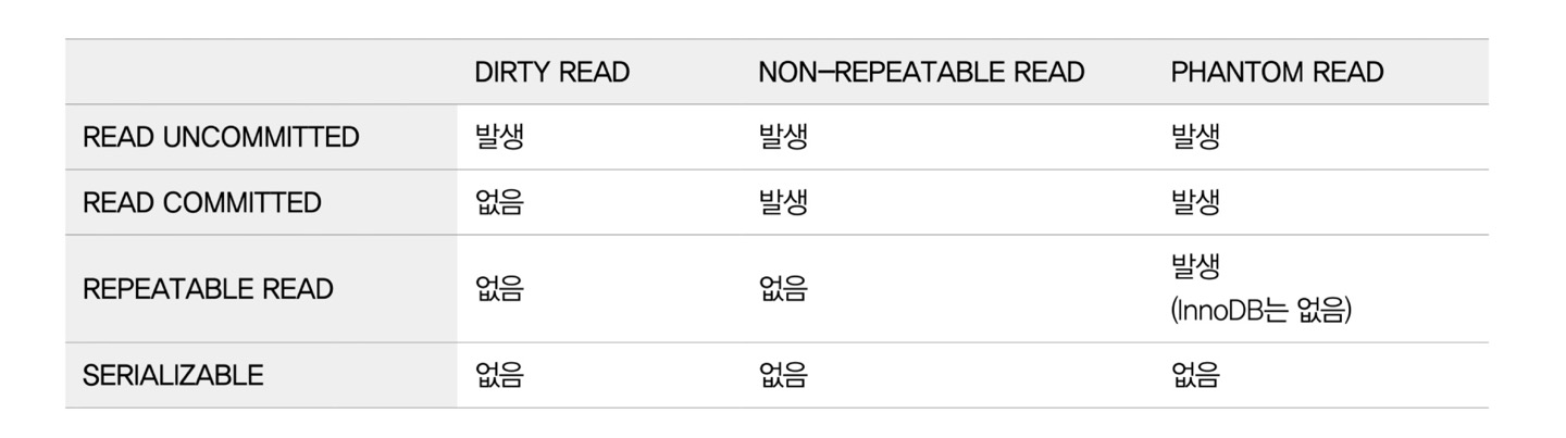- READ UNCOMITTED(Dirty Read 발생)은 일반적인 데이터베이스에서 사용하지 않는다.