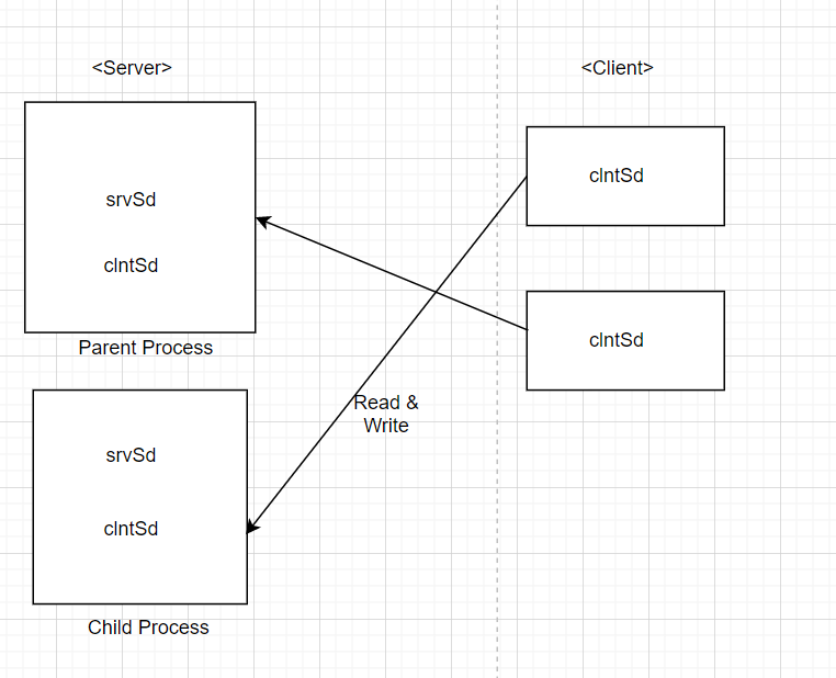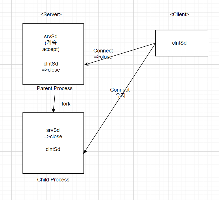 앞에서 설명한 Parent & Child Process가 필요한 기능의 파일 디스크립트만 남기고 close()하는 과정 처럼, Parent Process는 clntSd를 , Child Process2는 srvSd를 close()하여,