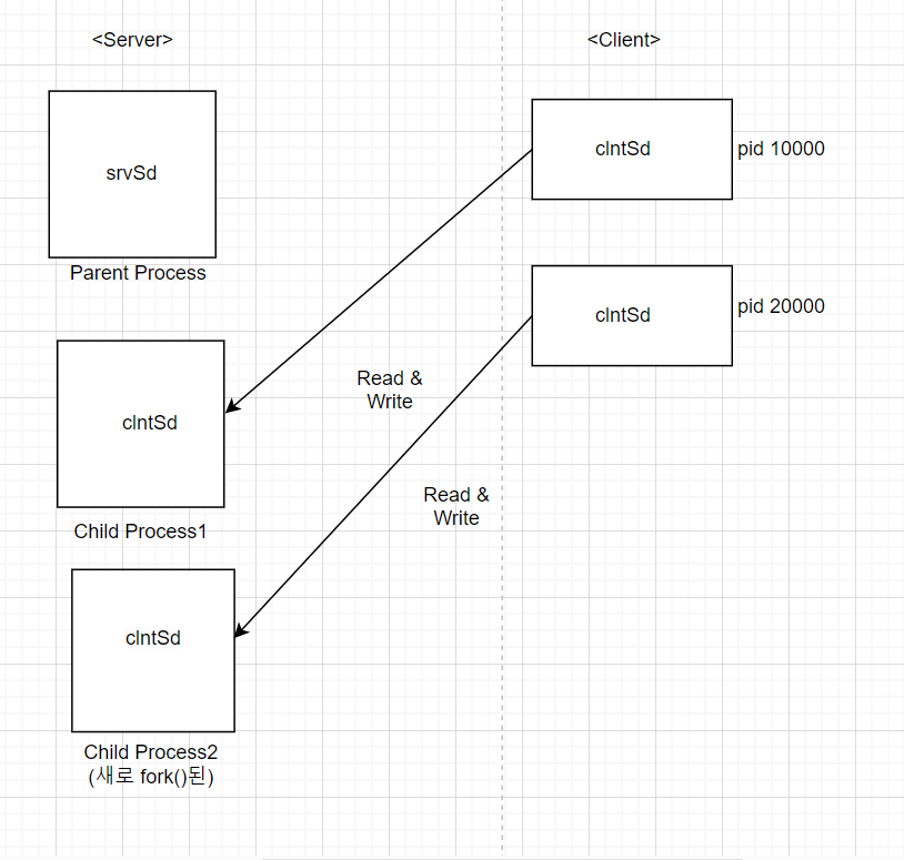 Parent Process는 다시 새로운 클라이언트를 accept(), srvSd를 이용해 기다리고, Child Process2는 새로 연결된 pid 20000인 클라이언트와 통신하여 read & write 작업을 수행하게 된다.
