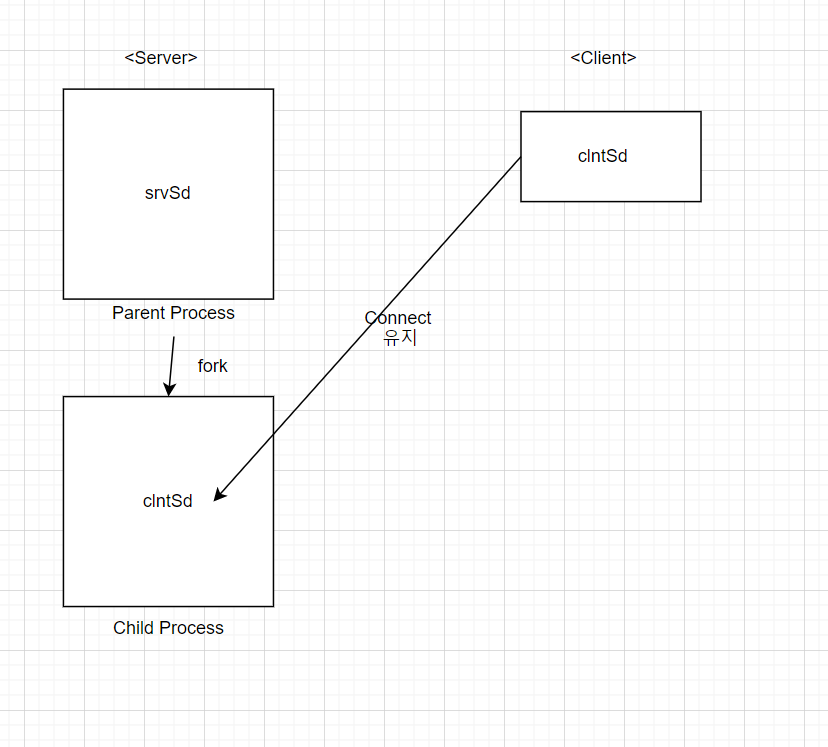 -이후, fork()함수를 이용하여 Parent Process정보를 복제하여 Child Process를 생성한다. srvSd와 clntSd 두 소켓이 그대로 fork() 되어 Child Process에 복사되어 나타난다.