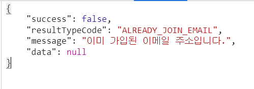 다음은 이미 가입되어있는 이메일을 입력하여 회원가입을 진행하고 있을때 개발자 도구를 통해 Response를 참고했는데,